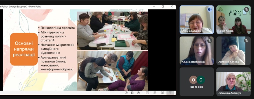 Практичний психолог Буздиган Оксана (Комунальний заклад «Заклад дошкільної освіти (ясла-садок) «Десняночка» села Сосонка Стрижавської селищної ради») ділилася досвідом роботи на тему: «Профілактика емоційного вигорання педагогів закладів дошкільної освіти: ресурсний підхід через арттерапію та модель BASIC Ph» та представила власну систему профілактики емоційного вигорання у вихователів, що передбачала демонстрацію арттерапевтичної техніки, спрямованої на зниження емоційної напруги та формування внутрішніх особистісних опор.