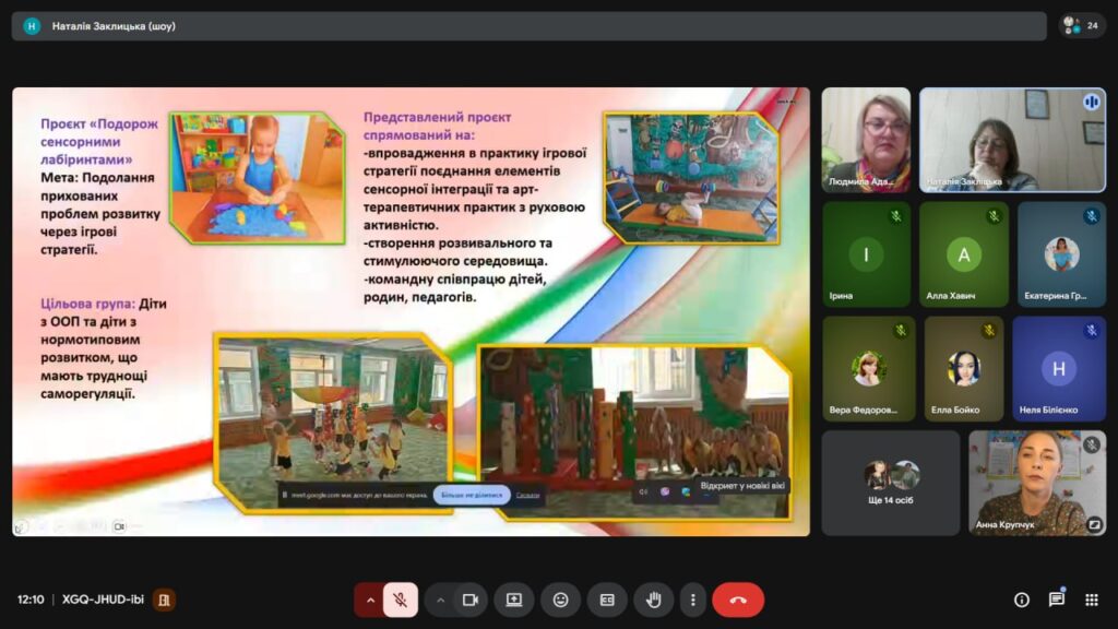 Закліцька Наталя, практичний психолог Комунального закладу «Дошкільний навчальний заклад №23 Вінницької міської ради», презентувала інноваційний проєкт «Подорож сенсорними лабіринтами, або подолання прихованих проблем», в якому розкрила системну модель психолого-педагогічного супроводу учасників освітнього процесу з метою подолання порушень сенсорної інтеграції у дітей, як прихованого бар’єра труднощів у навчанні та емоційної нестабільністі. Звернула увагу на особливості діагностики за допомогою опитувальних листів та практичне застосування сенсорних дієт у роботі дошкільного закладу та в родині.
