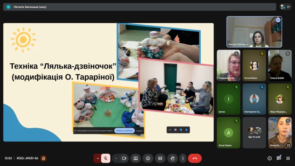 Савчак Наталя, практичний психолог Комунального закладу «Заклад дошкільної освіти №20 Вінницької міської ради», поділилась практиками арт-терапії, які допомагають зміцнювати стресостійкість та відновлювати внутрішні ресурси педагогів, познайомила з цікавими прийомами роботи з дітьми, що сприяють безпечному проживанню емоцій на тілесному рівні, формують у дошкільників навички спостереження за своїми тілесними відчуттями.